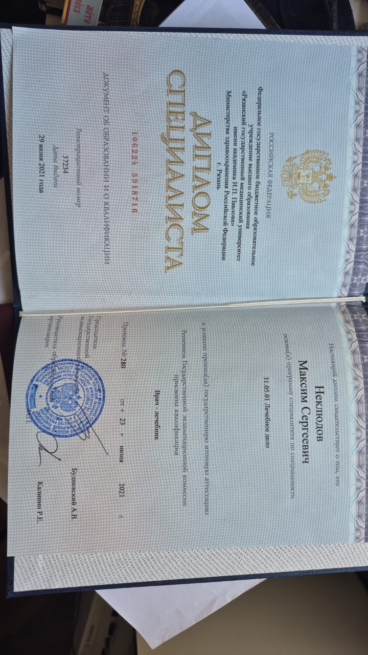 23.06.2021 — Рязанский государственный медицинский университет им. И. П. Павлова «Лечебное дело», высшее образование